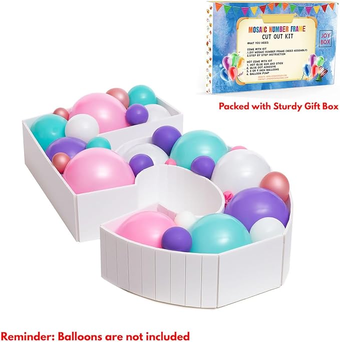 - PRE-CUT KITS FOR INSTANT GLAM: Our mosaic balloon frame is designed for quick and hassle-free assembly. Just grab your glue gun, follow the easy instructions (included), and witness the magic unfold in your celebration with a Joybox Design balloon number frame.
