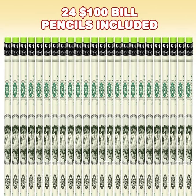 - WRITING MADE FUN: Make it rain with these cool $100 bill pencils! Every set comes with 24 pencils, each 7.5” long and in a replica of the 100-dollar bill. Doodle away as good ol’ George looks up at you; write with those pencil feeling like money.
