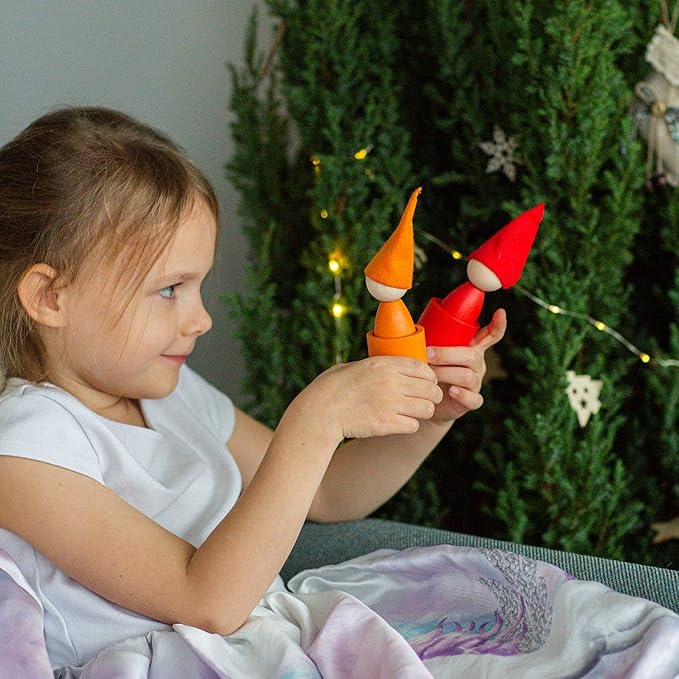Ulanik Large Peg Dolls in Cups with Hats Toddler Montessori Toys for 3 Year Old + Wooden Waldorf Dolls for Learning Color Sorting and Counting β 12 Gnomes