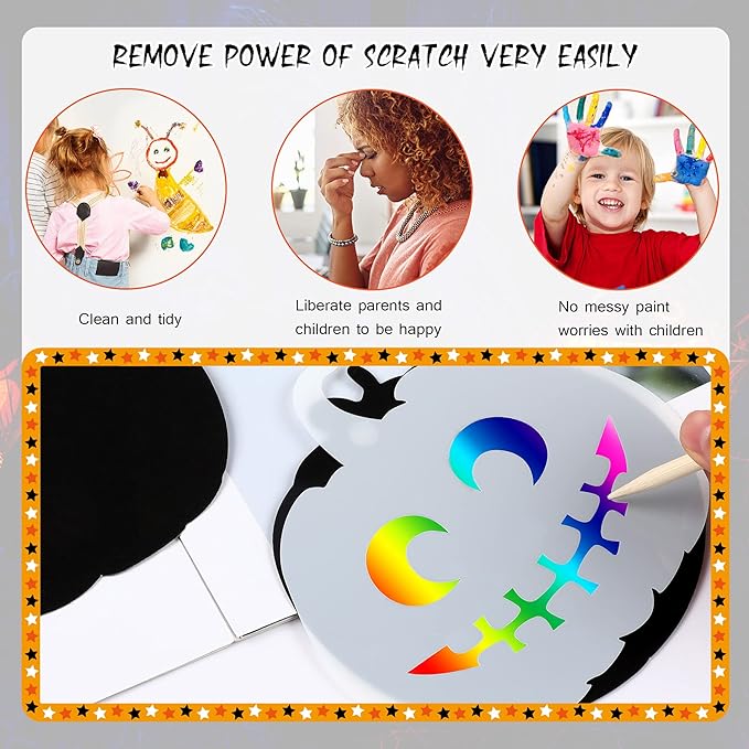 - Safe Material: Our Halloween scratch papers for kids are made of quality thick paper, which is not easy to tear. The magic rainbow colors and patterns are hidden under the matte coating. Scratching sticks are made of wood, which are not easy to deform, please rest assured for children to use.