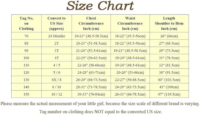 - Size for baby, toddler girls and little kids: 24 months, 2T, 3T, 4T, 4-5, 5-6, 6X-8, 8-10 and 10-12. Age is only an approximation of size. Please measure the actual body size and refer to the size chart to choose a proper size for best fit. There may be minor size difference depending on size measuring method.