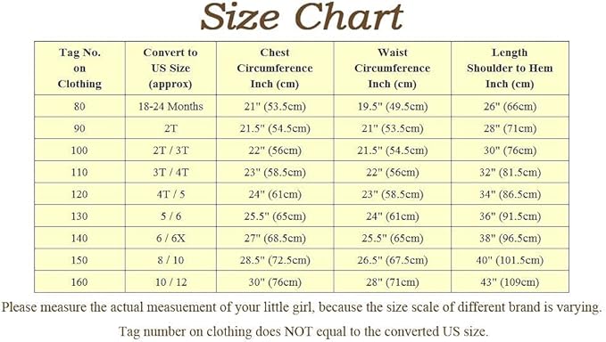 - Size for toddler and little girls: 18-24 months, 2T, 2T to 3T, 3T to 4T, 4T to 5T, 5-6, 6-6X, 8-10 and 10-12. Age is only an approximation of size. The dress is True to Size, please measure the actual body size and refer to the size chart to choose a proper size for best fit. There may be minor size difference depending on size measuring method.