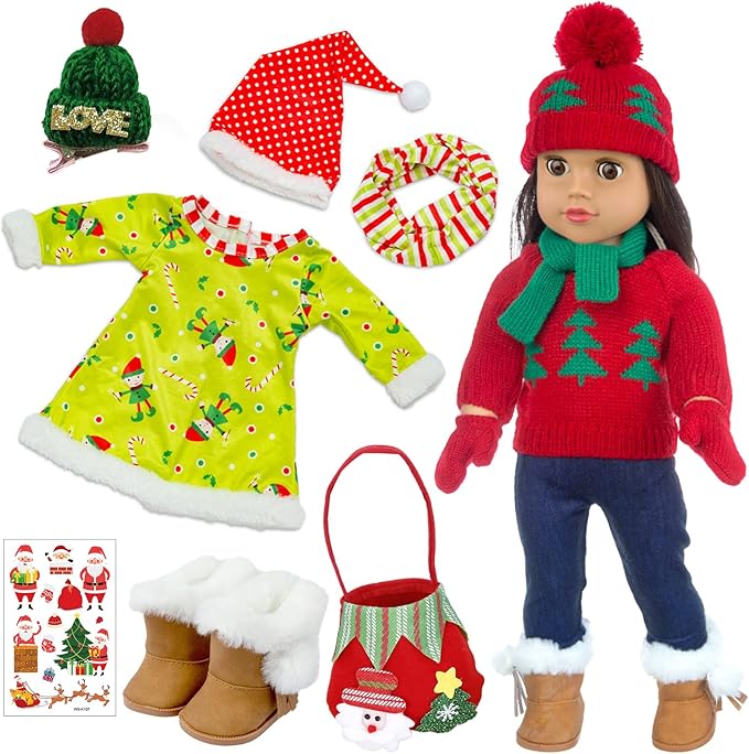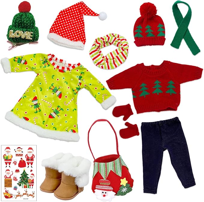 - Package Includes: 1*hairpin, 2*hat, 2*scarf, 1*Christmas skirt, 1*Christmas sticker, 1*candy bag, 1*sweater, 1*pants, 1*boots and a pair of gloves(Please kindly know that dolls are NOT included).