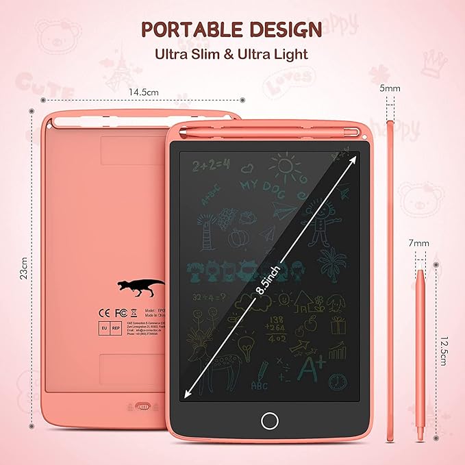 - Portable for Kids Road Trip: The 8.5-inch drawing pad for kids weights 4.55 oz for you easily carry the kids writing tablet in a backpack, schoolbag, briefcase; The toy is very suitable for children aged 3-8 years to use for airplane, car activities, road travel. Lock Function: Slide the lock button on the back of the writing tablet to prevent accidental clearing, protect your creation! Press the erase button to clean the screen.