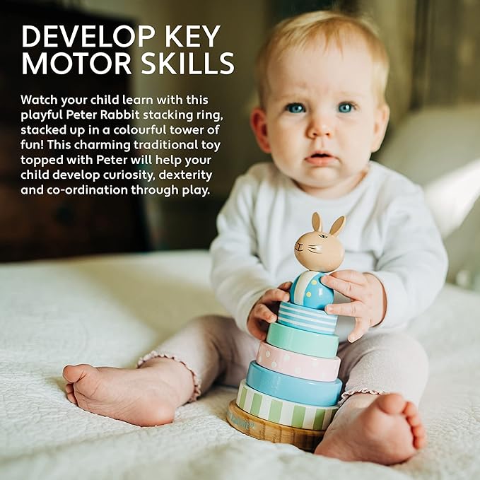 - This traditional wooden stacking ring is the perfect toy for toddlers. Painted in beautiful pastel colors and patterns, with Peter sitting on the top!