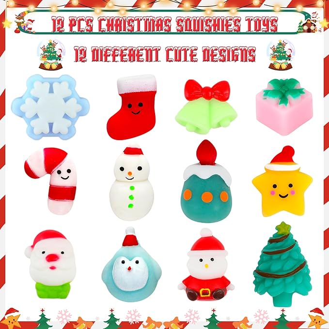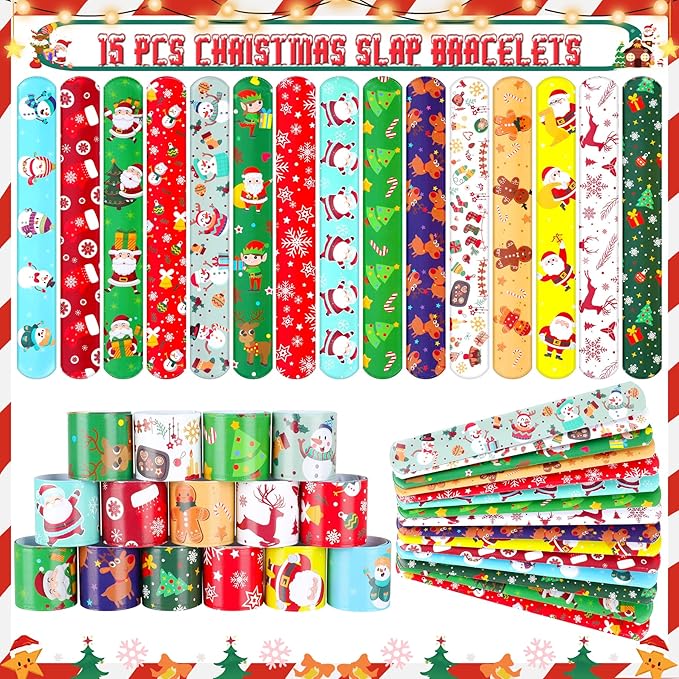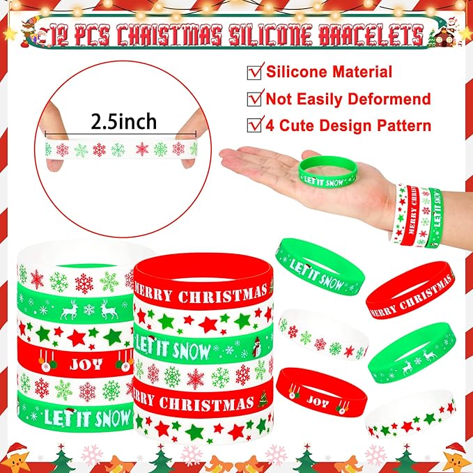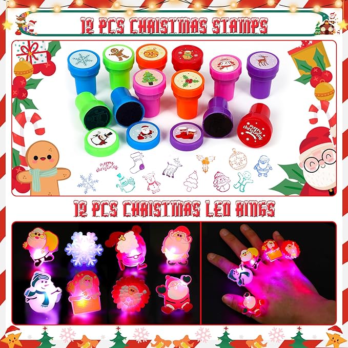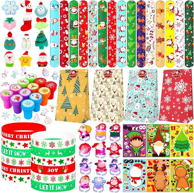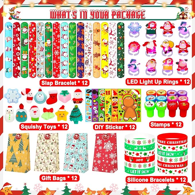 - PACKAGE INCLUDE - Christmas Party Favors Set includes 12 PCS Squishy Toys, 15 PCS Slap Bracelet, 12 PCS Silicone Bracelets, 12 PCS Christmas Stamps, 12 PCS DIY Stickers, 12 PCS LED Rings, 12 PCS Gift Bags. Total 87 PCS christmas party favors toy in your package.