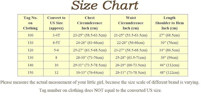 • 6 sizes for toddler and little girls, 3T - 4T, 4T - 5T, 5T - 6, 8, 10 and 12. Great for many special occasions: princess birthday party dress, themed party, Halloween costumes, Christmas party fancy dress, holiday dress, Easter, thanksgiving outfits, cosplay clothes, children tea party, photoshoot outfits, carnival costume, play wear outfits, ball gown etc.