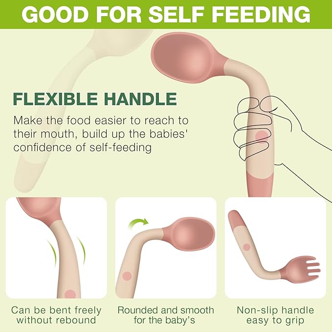 • Good for Self Feeding: this toddler fork and spoon set can be curved, they can be bent left or right or bent forward 90 degrees without rebounding, good for babies to learn to feed by themselves, brings baby with fun and interesting of learning to eat independently, helps those who have struggled with utensils, help them to hold food better, make the food easier to reach to their mouth, build up the babies' confidence of self-feeding