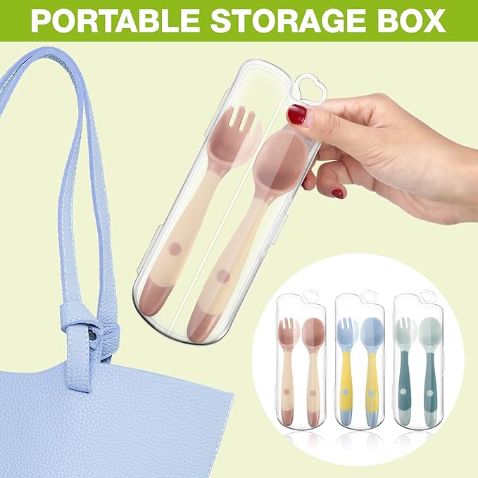 • toddler utensils baby spoon fork set travel case silicone self feeding training kids bendable handle silverware 12 18 months first holder cutlery rubber carrying storage beginner grip heat resistant safe