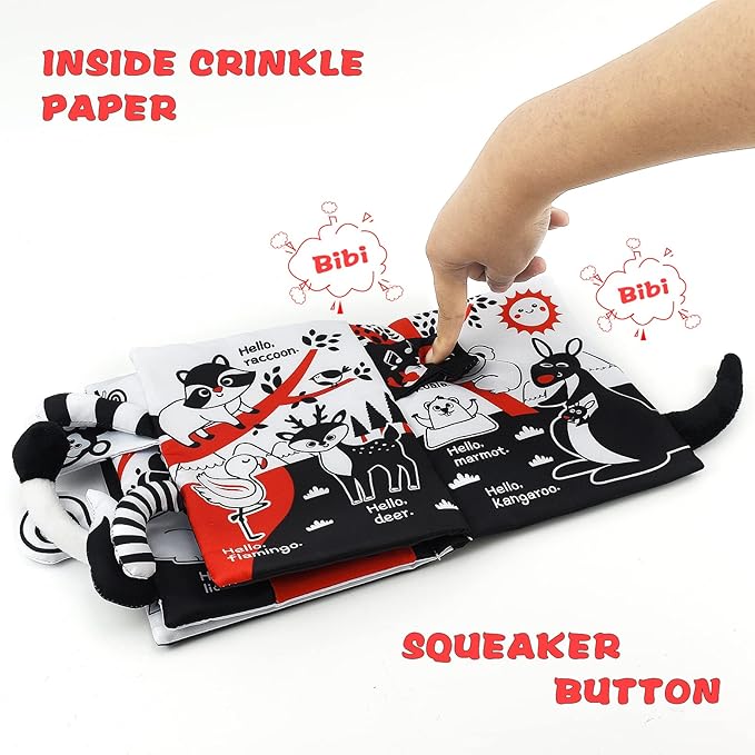- BABY’S FIRST BOOK: Baby’s gonna love this high contrast tails book, this soft book is in black, white and red, good for newborns’ eyesight development. Rustling and squeaky sound from the crinkle paper and squeaker button attract baby’s attention