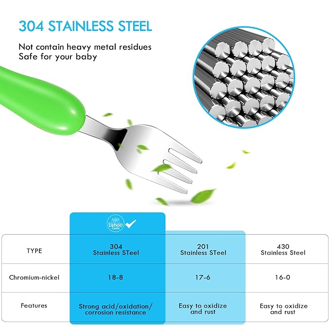- SAFE TODDLER UTENSILS SET: Made of durable food grade stainless steel, all non-corrosive, BPA-free and easy to clean (NOT dishwasher safe to avoid color loss)