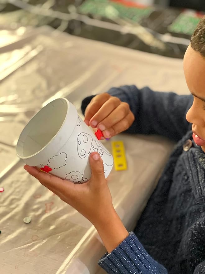Deluxe Classroom Bulk 12 Pack of Decorate Your Own DIY Cardstock Craft Flower Pots with Hundreds of Foam Flowers and Bugs, and Acrylic Gems and Jewels