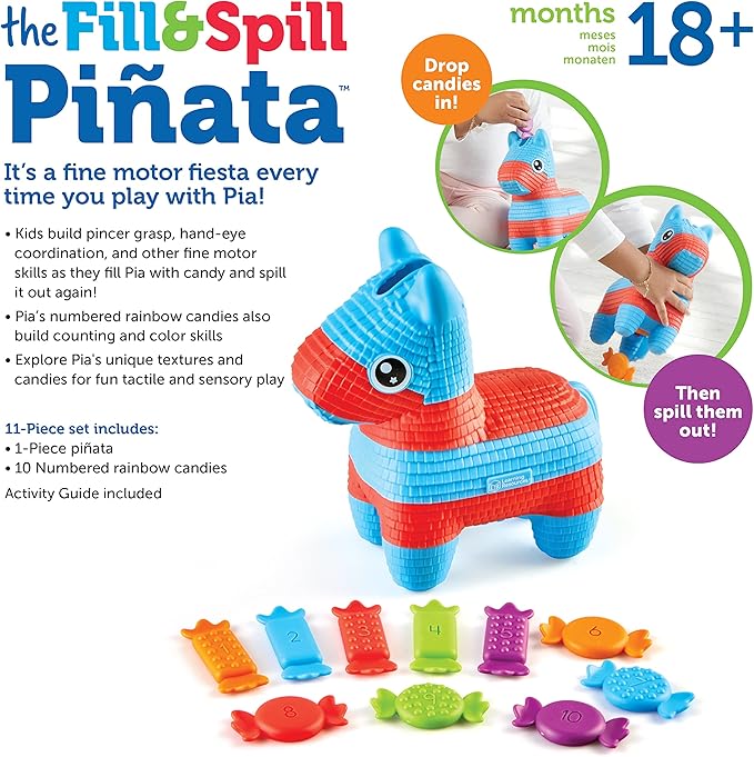 - Ages and Stages: Specially designed with little ones in mind, Pia the Fill & Spill Piñata helps kids as young as 18 months build counting, color, tactile, and preschool fine motor skills!