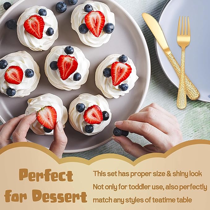 - 【MATURE APPERANCE】Special hammered pattern can easily grasp children’s interest, They will be excited to use the silverware like parents’ and try feeding themselves with their own cutlery, Highly developing their independence and cultivating kids’ good habit