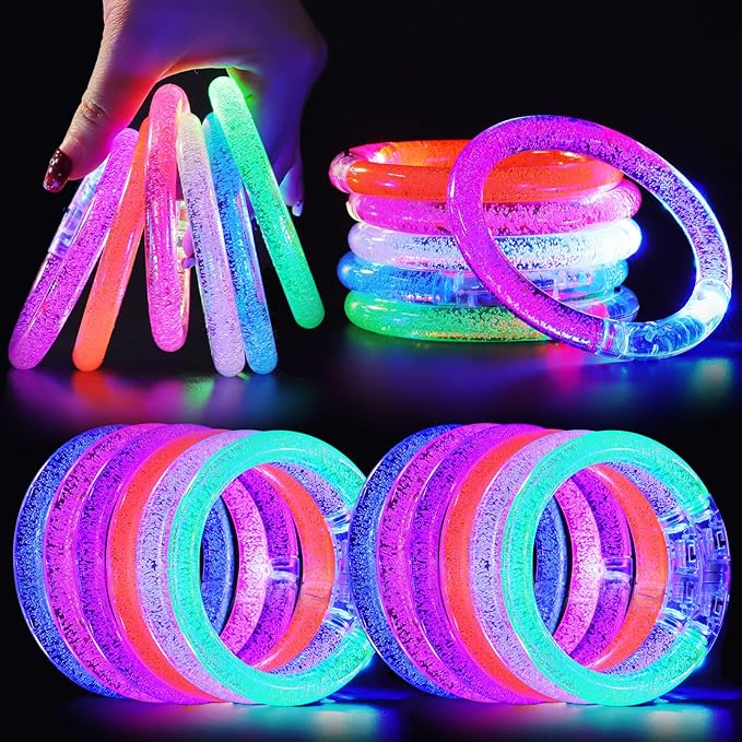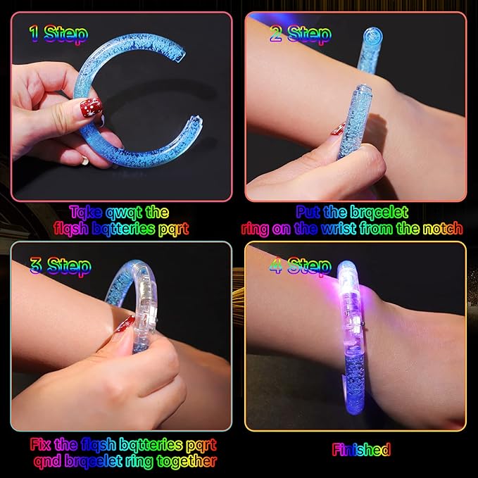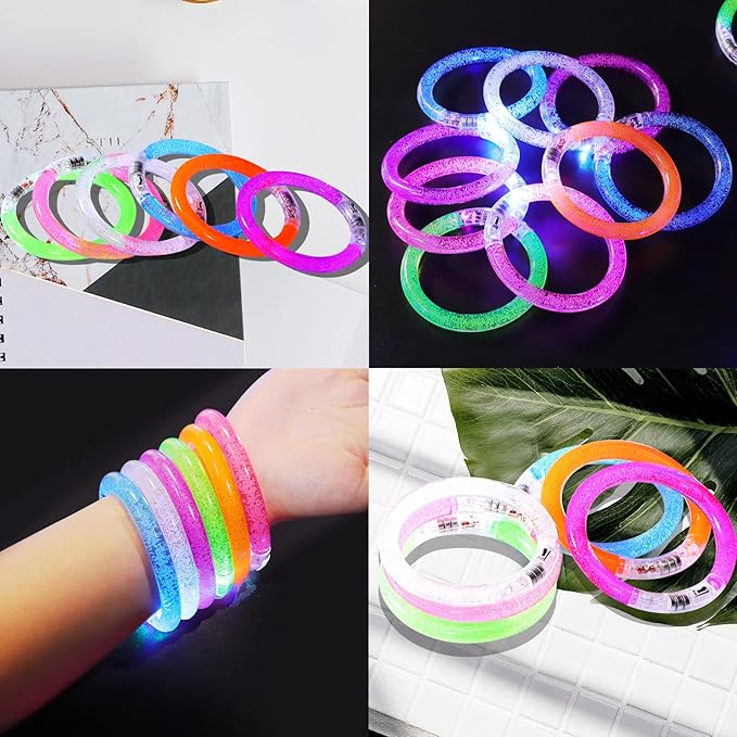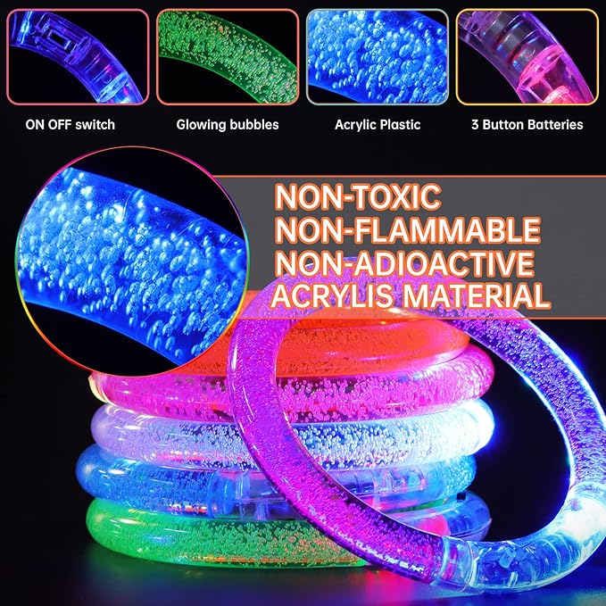 - High Quality LED Bracelets Party Supplies: These light up bracelets are well made and made of lightweight, durable hard plastic. There are many irregularly distributed bubbles inside the luminous bracelet, which diffuse light through the bubbles, bringing an extraordinary visual experience at night.