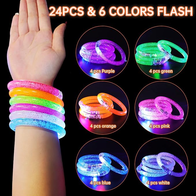 - Great Value LED Bracelets Set: This LED glow bracelet has 24 glow Bracelets in 6 different colors. Pink, purple, blue, green, orange, white, there are 4 bracelets for each color, the light-emitting bracelet has three flashing modes, fast flashing, super bright flashing and alternating flashing, various flashing modes cycle for you to create different atmosphere.