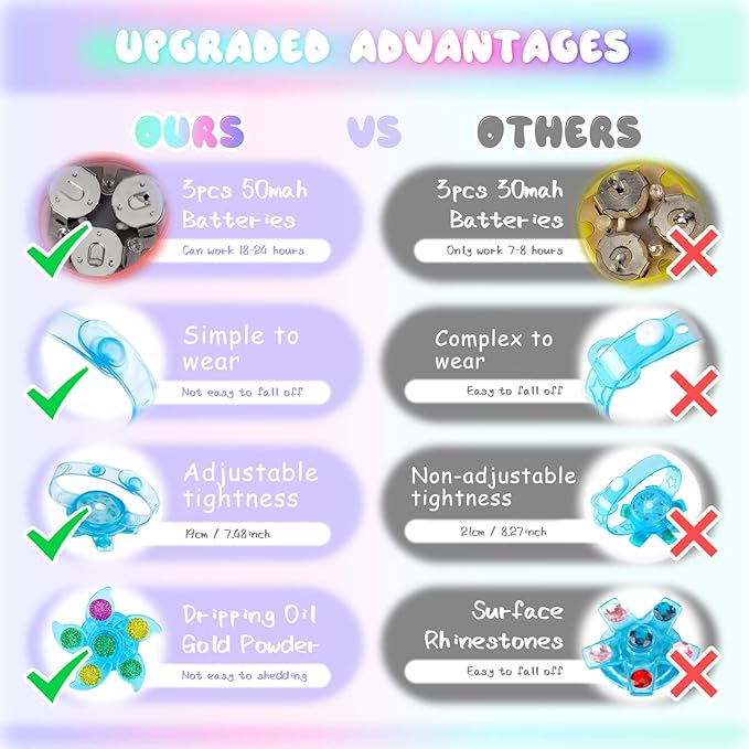 - Long Lasting Batteries & Safe Design: Built in 3pcs 80mah button batteries, provides total 240mah battery capacity, will support the LED lights of bracelet to work for 18 - 24 hours. Compared to the rhinestones surface, the dripping oil gold powder printing is not easy to shedding, also prevents kids accidentally eating them.