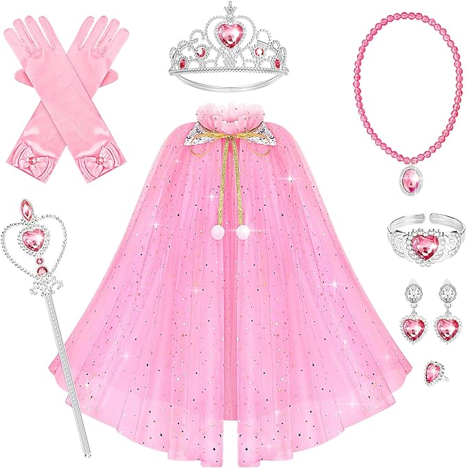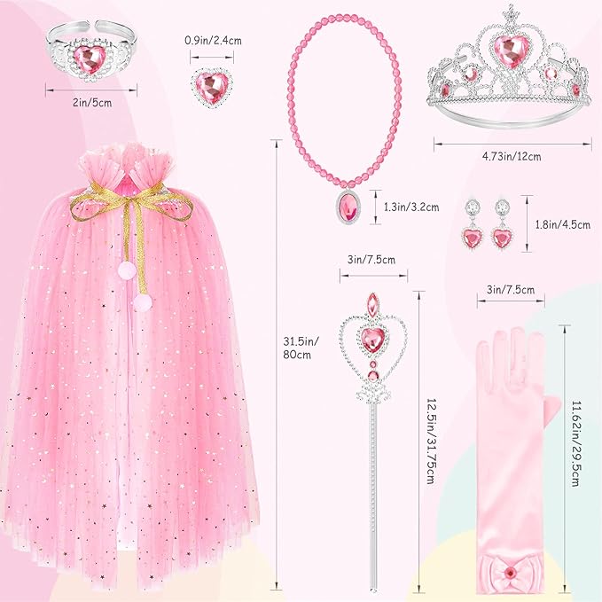 • Princess Dress Up Set: Come with princess cape, princess crown tiara, princess magic wand, princess gloves, bracelet, ring, necklace, clip-on earrings. Rich dress up accessories for your little girls.