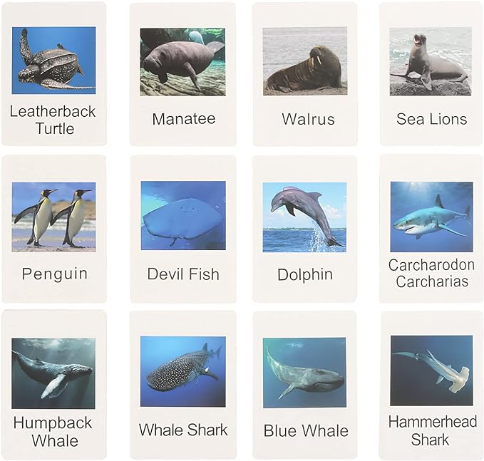 Small Montessori Animal Figures with Flash Cards, Realistic Animal Figurines Toys, Montessori Materials Homeschool Preschool Science Educational Matching Game for Toddler Kids (Sea)