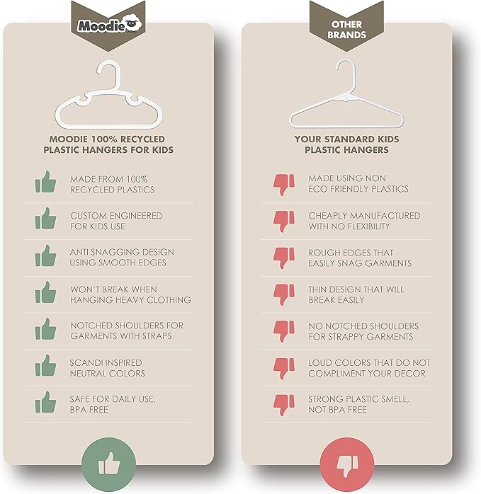 - 🌱 Environmentally Friendly: We care about the planet, which is why our childrens clothes hangers are made from recycled PP plastics. By giving plastics a second life, we're doing our part to reduce waste and protect the environment. We're proud to be the first children's hangers company to offer hangers for kids made entirely from recycled materials.