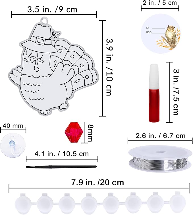 • Size: Thanksgiving sun catchers are about 3.5"-4.4" long and 4.2"-4.6" wide. Each bottle of suncatcher paint is 0.2 fl oz/6ml in capacity. Each mini empty paint pot holds 0.06 fl oz /2ml of paint. Acrylic beads are about 0.3" in diameter. Fishing thread is about 590.5" long. Suction hooks are about 1.5" in diameter. Each fall gift label sticker is about 2". These cute autumn window paint art suncatchers can be used as ornaments on the kitchen windows, trees, glass door, car windows, and so on.