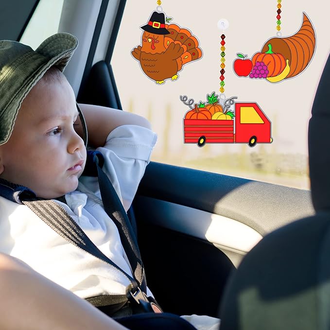 • Quantity: 24 sets fall Thanksgiving suncatcher ornaments decorations DIY suncatcher window paint art craft kits include 24 pcs Thanksgiving sun catchers in 8 designs, each design has 3 pcs. 16 bottles of 8 fall colors suncatcher paints (6ml per bottle), 1 strip of 8 empty paint pots, 24 pcs paintbrushes, 288 pcs acrylic beads, 1 roll of fishing thread, 24 pcs suction hooks, 24 pcs fall gift stickers. Each suncatcher has a hole at the top for hanging. Kids and adults can enjoy this art project.