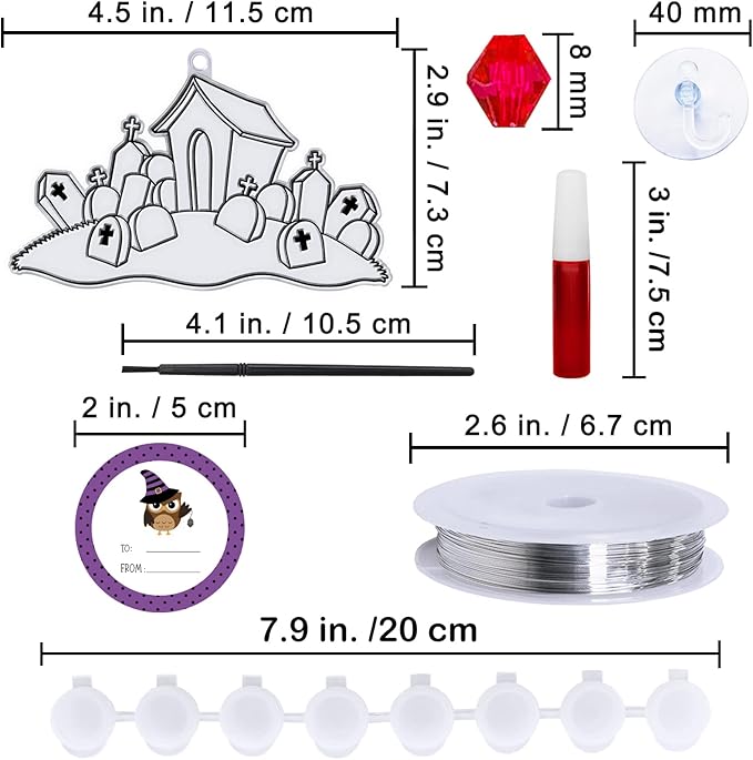 - Size: Halloween suncatchers are about 4" in diameter depends on the shape. Each bottle of suncatcher paint is 0.2 fl oz/6ml in capacity. Each mini empty paint pot holds 0.06 fl oz /2ml of paint. Acrylic beads measure about 0.3" in diameter. Fishing thread is about 590.5" long. Suction hooks are about 2.3" in diameter. Each Halloween gift label sticker is about 2.2". These not so spooky Halloween window art decorations are perfect to be hung in the windows or glass doors to catch the sunlight.
