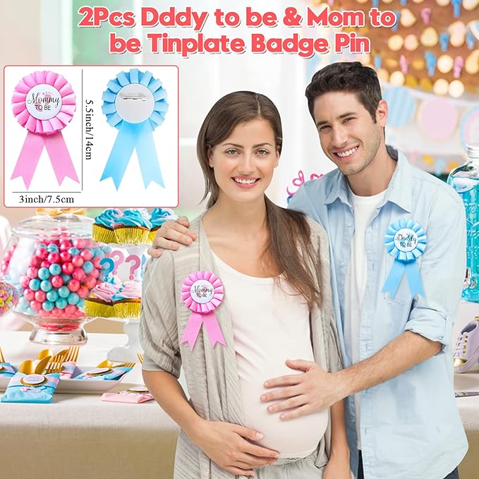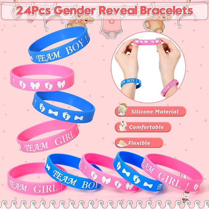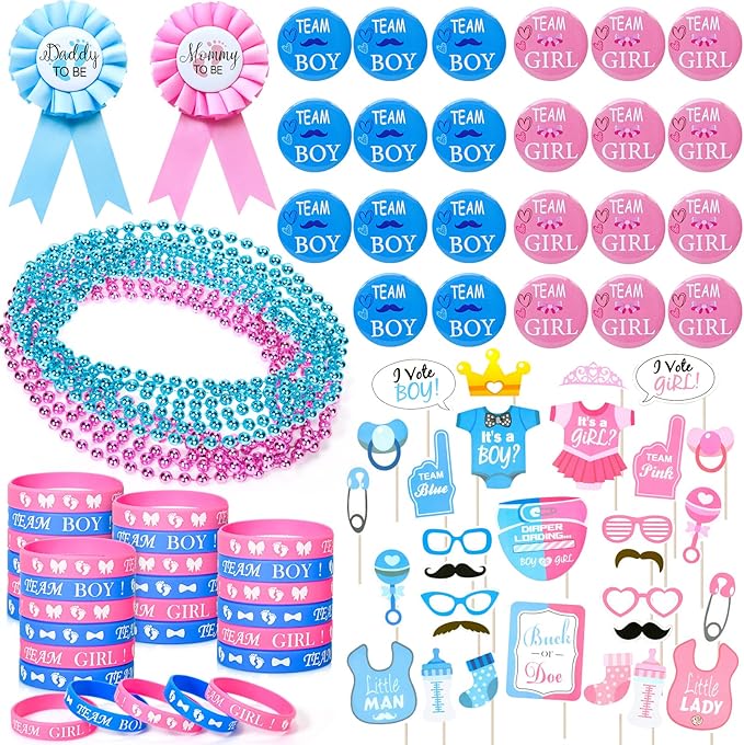 - Gender Reveal Party Supplies Favors: We have carefully designed a rich set of gender reveal themed gifts for expectant parents. It comes with 2 pieces daddy and mommy to be badge pins, 24 team boy or girl button pins, 24 silicone bracelets, 24 necklaces, 30 photo props, for a total of 104pcs. Here's a luxurious complete set of gender reveal party favors, suitable for adults and kids, to help you entertain up to 24 guests for a grand gender reveal party