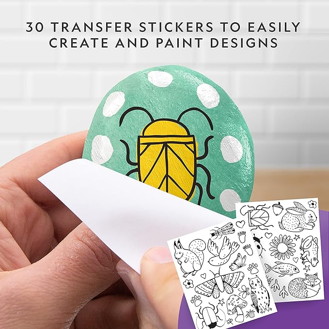 - TRANSFER DECALS FOR EASY DECORATING – Two sheets of transfer decals add to the fun and make it simple for kids to add creative flair to their stones! Just peel, stick, and wet the chosen design and watch it transfer like magic onto the rock!