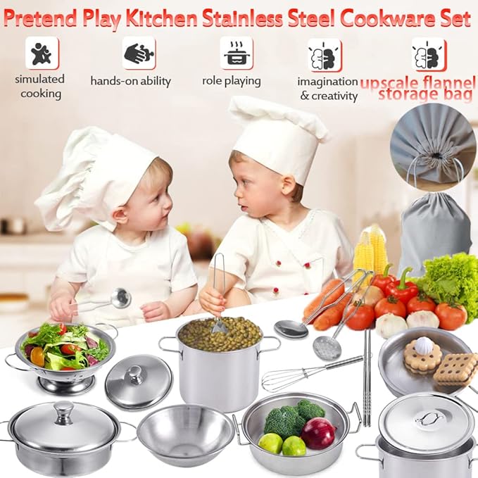 - 【PREMIUM QUALITY & CHILD SAFE】The play pots and pans set is unmatched durability, adopts fine polishing, smooth edges won't hurt your little angel's little hands.Handles is welded firmly, not easy to break,can be use on dishwasher safe and Durable . The miniature realistic stainless steel cookware toys all come in a high-grade flannel bag with a drawstring handle,neat and easy to carry. Give kids hours of fun to work hard like a mother !
