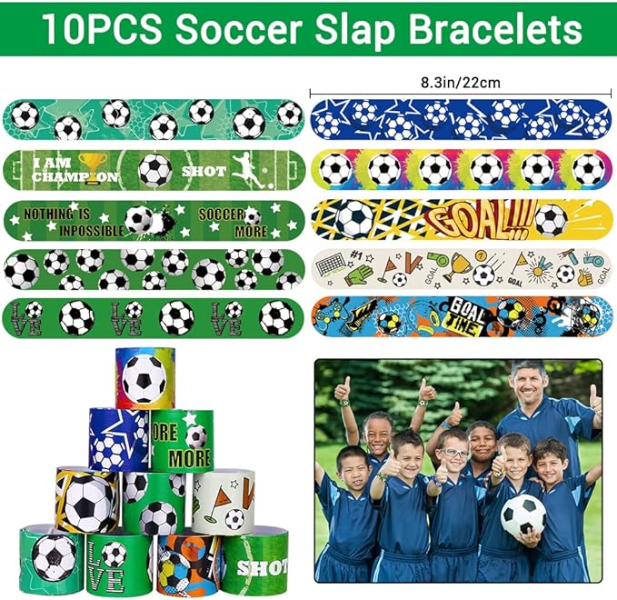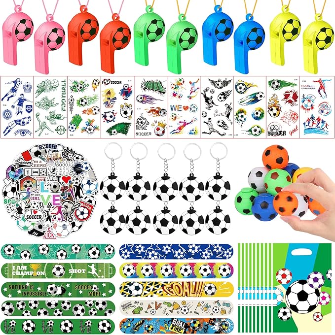 - FOOTBALL PARTY FAVORS SET:You will receive 10 PCS fidget spinner football ball,10 football word silicone bracelet keychains,10 soccer temporary tattoos,10 pieces of the football whistle,10 football Plastic bags,10PCS football slap bracelets,52PCS football stickers. Enough quantity for you to share these football party present with your kids and friends.