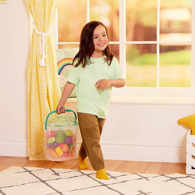 - Includes: This set comes with 32 pieces of play food, a kid-friendly book, and a bucket for easy storage.