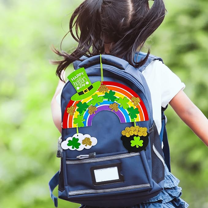 - 12 Sets St. Patrick's Day Rainbow Ornaments DIY St. Pat's Craft Kits: 12 pcs foam rainbow shaped cutouts, 12 pcs foam cloud shaped cutouts, 12 pcs foam black cauldron shaped cutouts, 12 pcs foam leprechaun hat cutouts stickers, 9 sheets gold glitter foam St. Patrick's Day stickers (72 pcs shamrock and lucky 4-leaf clover stickers and 144 pcs gold coin stickers), 12 sheets green foam clover stickers (96 pcs), 36 pcs satin cords, 12 pcs adhesive wall hooks, 1 pc step-by-step instructions.