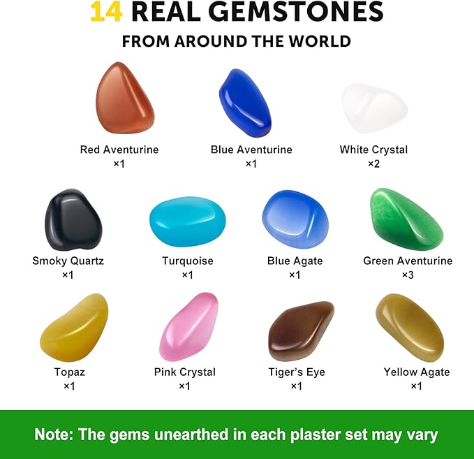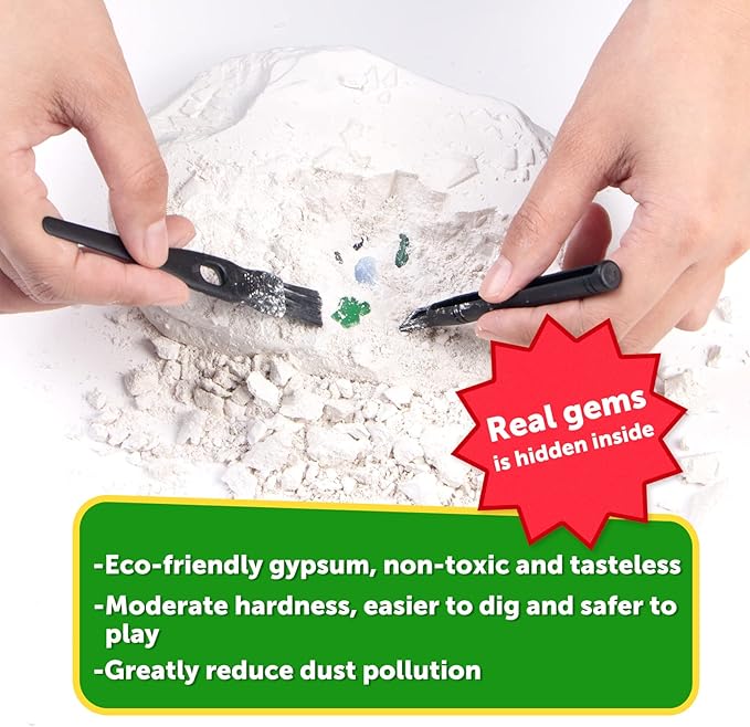- ⚒【Complete Digging Kit】Our gem digging kit is made of environmentally friendly and high-quality gypsum, non-toxic and odorless, which greatly reduces dust pollution and is safe for small children. Our plaster is moderately hard and easier to excavate when water is added. Kit includes basic digging tools: digging chisel, digging hammer, digging brush to help you dig 14 gems.