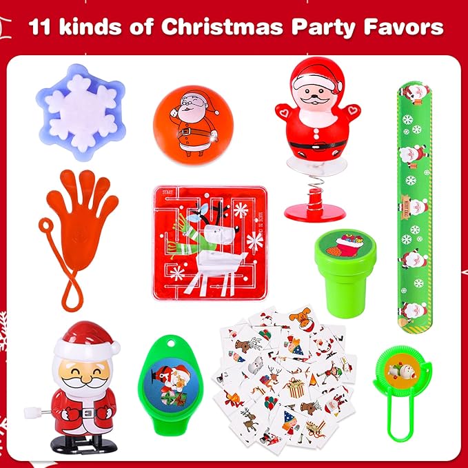 - Assorted Christmas toys: Includes 11 types of fun Christmas toys—2 wind up toys, 2 pull-back cars, 2 jumping poppers, 4 maze toys, 6 squishies, 6 stamps, 6 whistles, 8 sticky hands, 10 slap bracelets, 10 ejection frisbees, and 40 Christmas tattoos—totaling 96 pieces for endless joy and excitement.