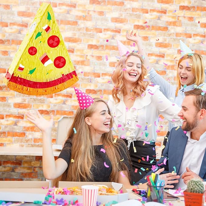 - Fun Piñata Game: the pizza Piñata comes with a blindfold, a bat and a pack of confetti that can be applied as party game props to add a lot of fun to the party; You can put on the blindfold and hit the Piñata a with a bat , to release the items inside