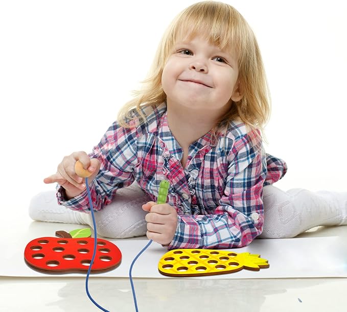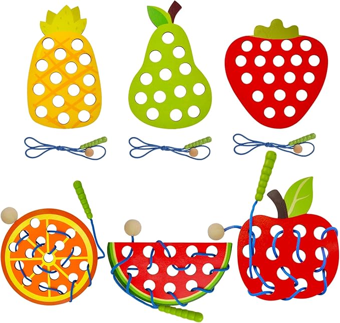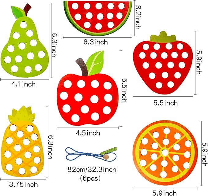 - 🍓【WOODEN LACING FRUIT TOYS】The lacing toy set includes 6 lacing ropes and 6 different sliced fruits: apple, watermelon, pineapple, strawberry, pineapple, pear. These wooden threading toys help to develop kid's imagination, hand-eye coordination, fine motor, cognitive and visual perception skills