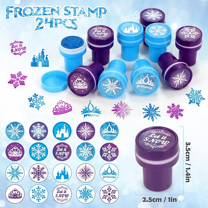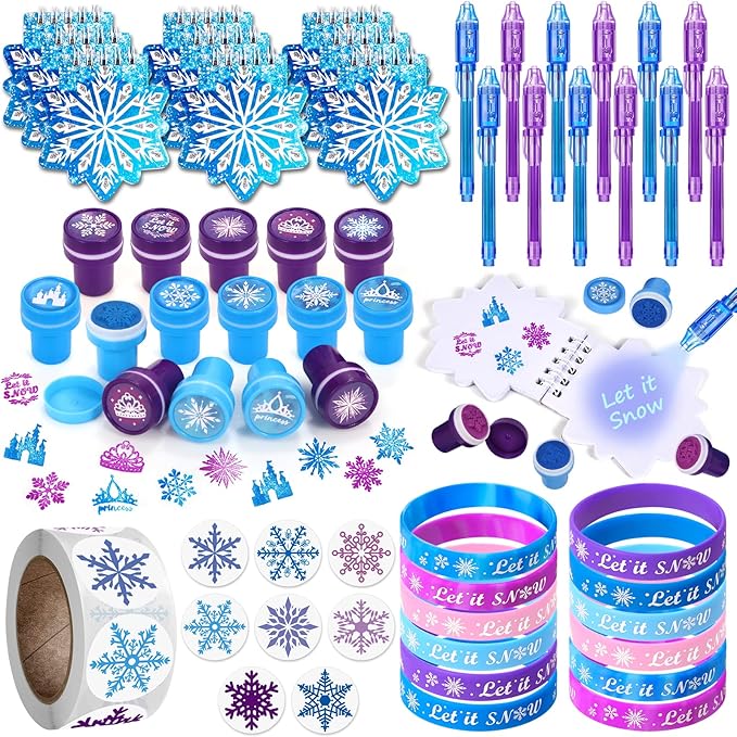 - Ideal Frozen Party Gifts: Our frozen party favors set comes in blue and purple, and most accessories feature snowflakes design. We especially added interesting invisible pens to better guard the little girl's secret. Not only does it make an ideal little gift, but it can also be paired with a frozen balloon garland kit. Ideal frozen party decorations, winter party favors for kids, snowflake party favors, winter wonderland party favors, winter themed party favors, frozen goodie bag stuffers