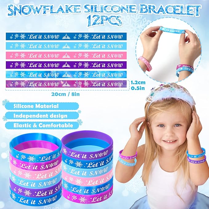 - Unique Frozen Birthday Party Favors: We offer 12 invisible ink pens (purple and blue), 12 snowflake notebooks, 12 frozen silicone bracelets, 24 stampers (with castle, snowflake, princess crown pattern), 1 roll of snowflake stickers, for a total of 61pcs. This is a complete set of elsa frozen party favors that kids especially girls will love, these are the perfect gifts