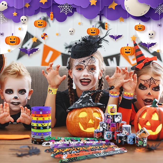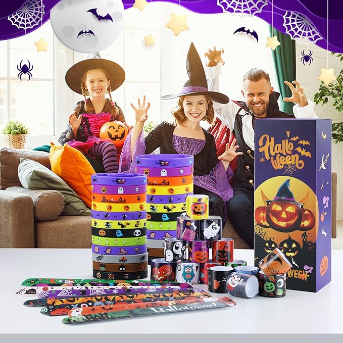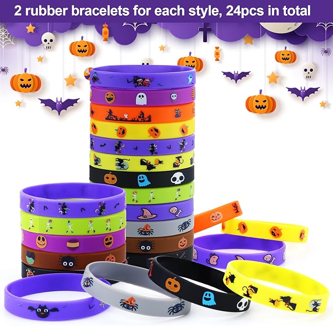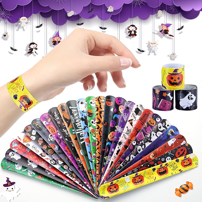 - Includes 24 different designs of Halloween slap bracelets, and 24 different designs of rubber wristbands with skulls,, witches, ghosts, hats, pumpkins, bats and cats and other classic Halloween elements!