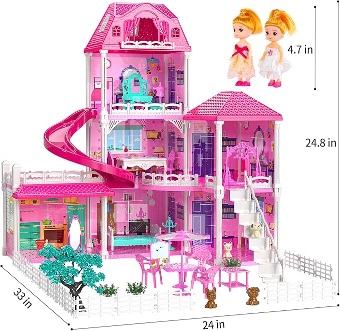 - Furniture and Accessories: Each room has home furniture, household appliances, slides and other accessories that are easy to move and arrange as your own ideas. The open-sided design adds more fun for your kids to watch the dolls from different angles