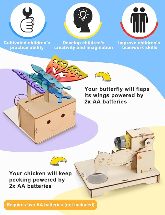 - A great gift for kids age 8 years and up: This STEM kit comes with all of the parts you need to build chicken toy, eletctric butterfly, lizard model, snail model and fish model. Great gift for birthday, Christmas, holidays, etc.