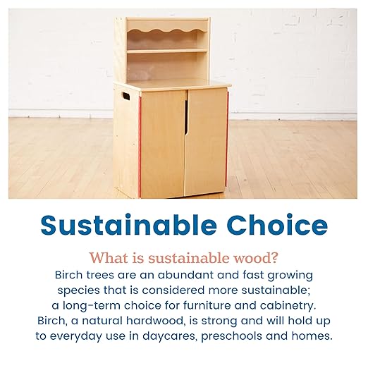 - Certified Safe: Institutional quality wooden play kitchen is GREENGUARD [GOLD] Certified for low VOCs, TSCA and CPSIA compliant; cut-out handles allow adults to pick up and transport