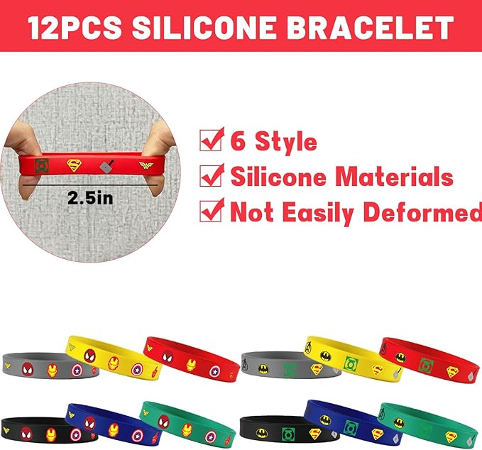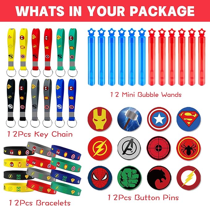 - Superhero Party Favor - The superhero themed party set includes 12 Bubble Wands, 12 Pcs Key Chain (2 Green, 2 Red, 2 Yellow, 2 Blue, 2 Black, 2 Gray), 12 Pcs Bracelets (2 Green, 2 Red, 2 Yellow, 2 Blue, 2 Black, 2 Gray), 12 Pcs Button Pins, 50 Pcs Stickers