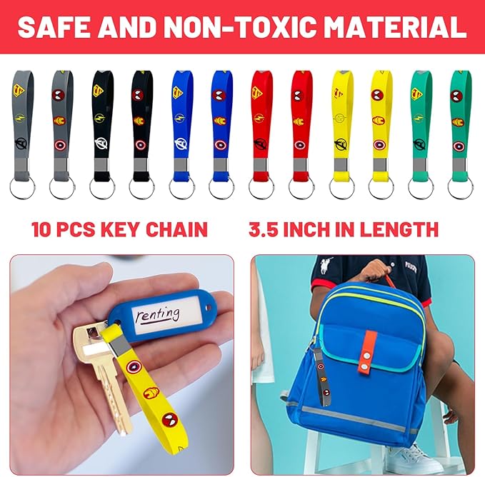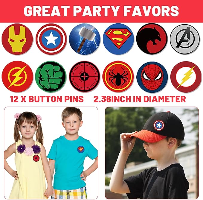 - Superhero Party Supplies for Kids - Add More Fun for themed Party- Our Key Chain, Bracelets, Button Pins and Stickers has several different styles, printed with superhero themed patterns. As themed party decorations designed for the most popular themes, it is the ideal toy for kids and the perfect party favor