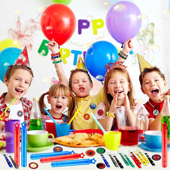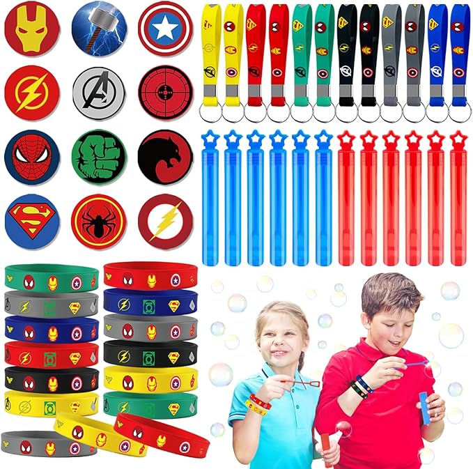 Superhero Party Favors Supplies 12 Bubble Wands 12 Keychain 12 Bracelets 12 Button Pins 50 Stickers Toys for Kids Boys Themed Party Favors Birthday Decorations