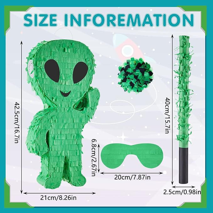 - Appropriate Size: the alien fiesta Piñata measures about 42.5 x 21 x 7.5 cm/ 16.7 x 8.26 x 2.95 inches, enough to store candy, chocolate, cookie, confetti, and many other trinkets, the Piñata stick and blindfold are also convenient to hold, compact and portable, easy to carry and store, suitable for various events and celebrations, adding a pleasant atmosphere