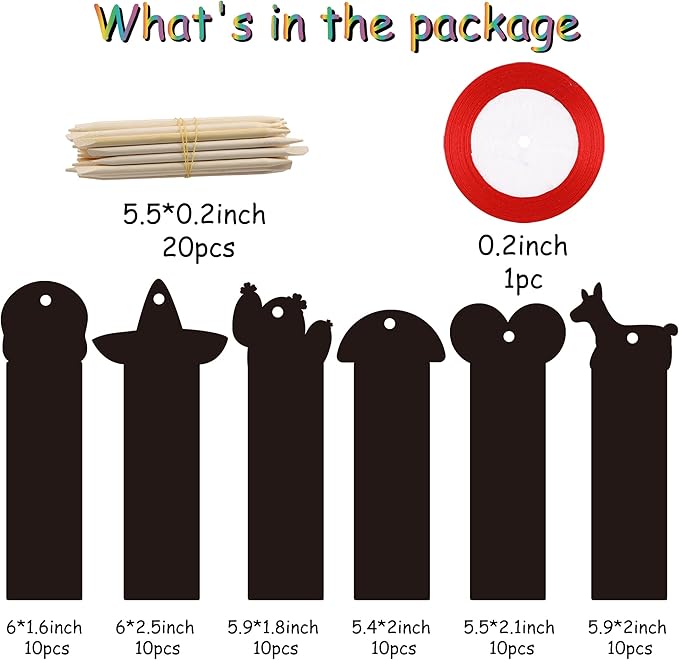 - Fiesta Scratch Bookmark Kit: The package contains 60pcs Fiesta scratch bookmarks. It comes with many Mexican elements such as guitar pinata cactus skull hat maracas. And 20pcs wood stick, 1 bundle of red ribbon. It is a special gift for kids to DIY their unique Mexican scratch card.