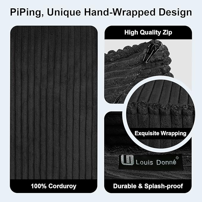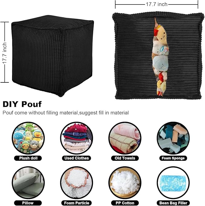 Louis Donné Unstuffed Pouf Ottoman Cover for Storage Black Square Poofy Ottomans Foot stool for Living Room Floor Cushion, Premium Corduroy Fabric, Footrest for Couch and Single Sofa 17.7"(Only Cover)