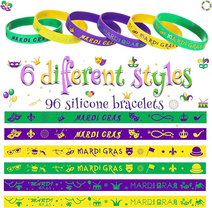 - Large Quantity for Diverse Needs: you will receive 96 pieces of Mardi Gras silicone wristbands with 6 different styles, 16 pieces for each style, large quantity to meet your demands for daily wear and sharing with family and friends